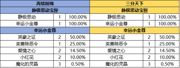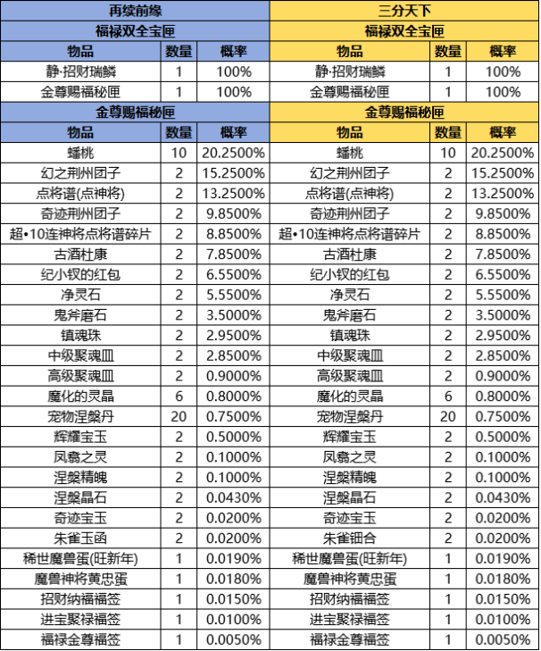 以下为本次礼包的内容以及概率公示(左侧再续前缘,右侧三分天下)