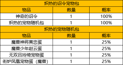 1. 本期公示礼包为:炽热的诏令宠物包、炽热的宠物随机包。