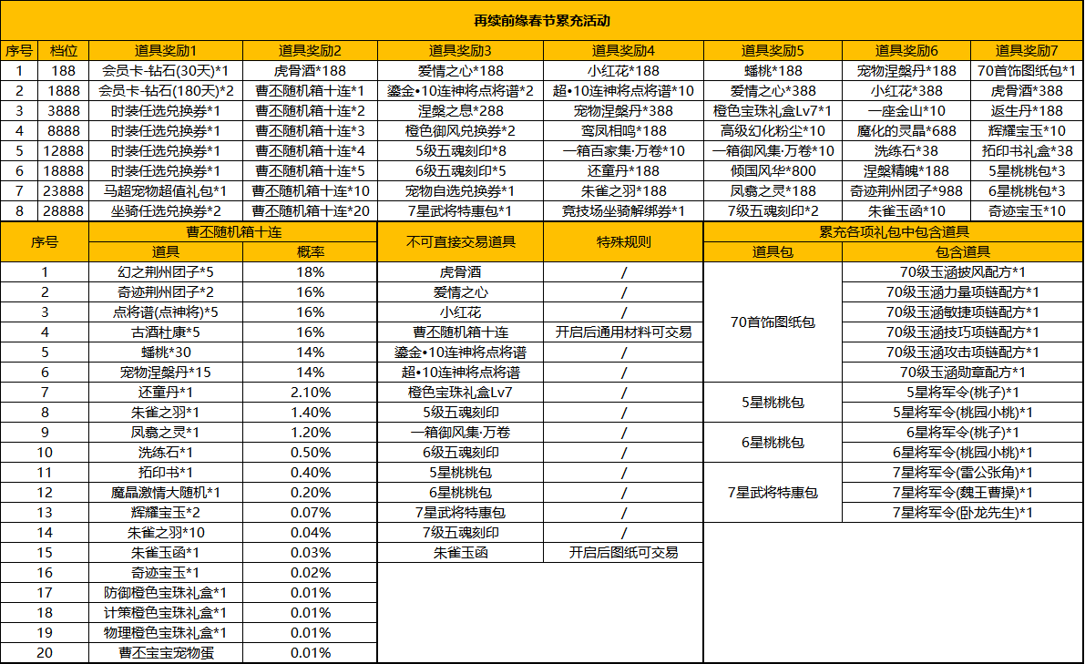 本次春节累充活动开启时间为2026年2月13日00:00:00至2026年2月27日23:59:59,提前祝愿各位玩家春节快乐,阖家幸福!